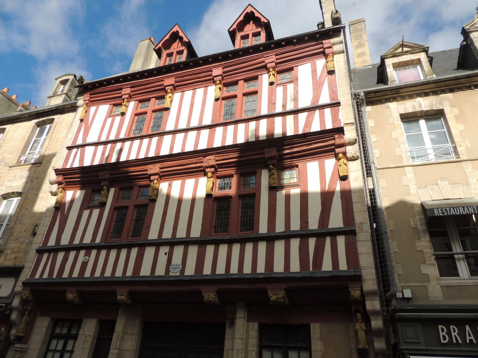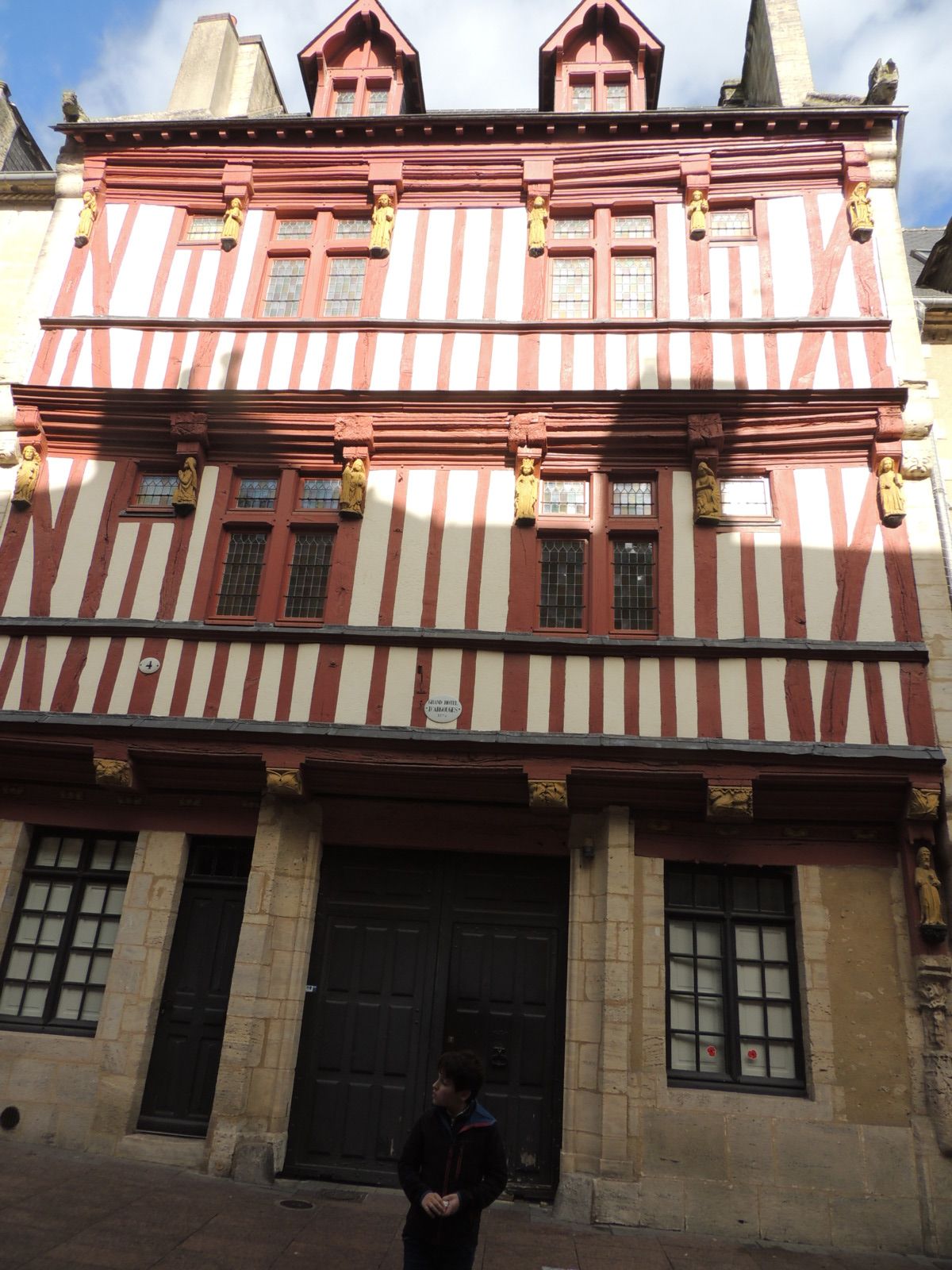 Nous avons commencé notre balade par le centre-ville, notamment les maisons à pan de bois. Parmi elles, la plus vieille  maison de Bayeux nous a particulièrement marqué : elle se situe dans un angle de la rue des Cuisiniers. Elle est vraiment atypique et marque immédiatement par son architecture ancienne et originale, très différente des autres bâtiments du quartier. En passant devant le Grand Hôtel d'Argouges, imposant et tranquille, nous avons bifurqué dans la rue des Cuisiniers – petite, animée, où tout sent le pain chaud et la sauce qui mijote.