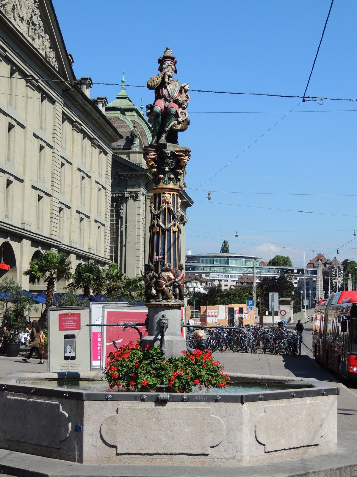 Les 11 fontaines, autres symboles de Berne décoratives (1545), lesquelles représentent des personnages historiques et folkloriques. La plupart sont dans la Marktgasse, qui devient ensuite Kramgasse puis Gerechtigkeitsgasse, une rue où il fait bon se promener et s'attabler à une terrasse. La plus connue des fontaines se trouvent sur Kornhausplatz : c'est la Kindlifresserbrunnen (fontaine de l'Ogre) et son géant mangeur d'enfant !