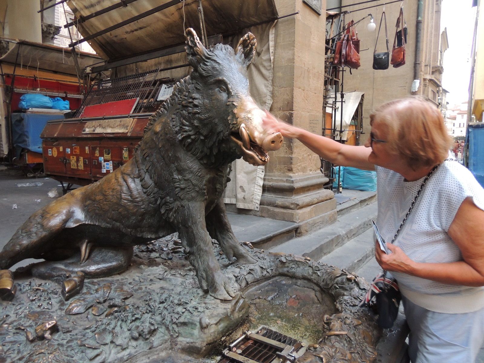 - Profitez de votre séjour à Florence pour vous porter bonheur. Cela est possible grâce à la Fontaine du petit sanglier « Fontana del Porcellino » située près du Pont Vecchio. Le sanglier est une statue en bronze datant du 17ème siècle réalisé par le sculpteur italien Pietro Tacca. Selon la tradition, la personne doit placer une pièce dans la bouche du sanglier puis frotter son museau. Si la pièce tombe dans l’eau par une petite grille, la personne aura de la chance et retournera à Florence.