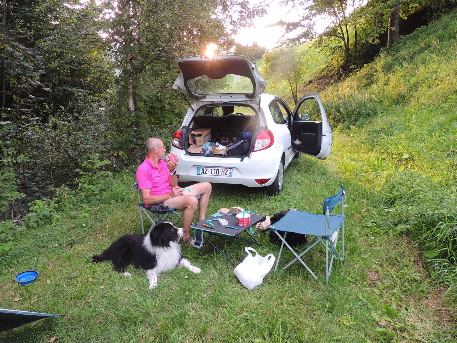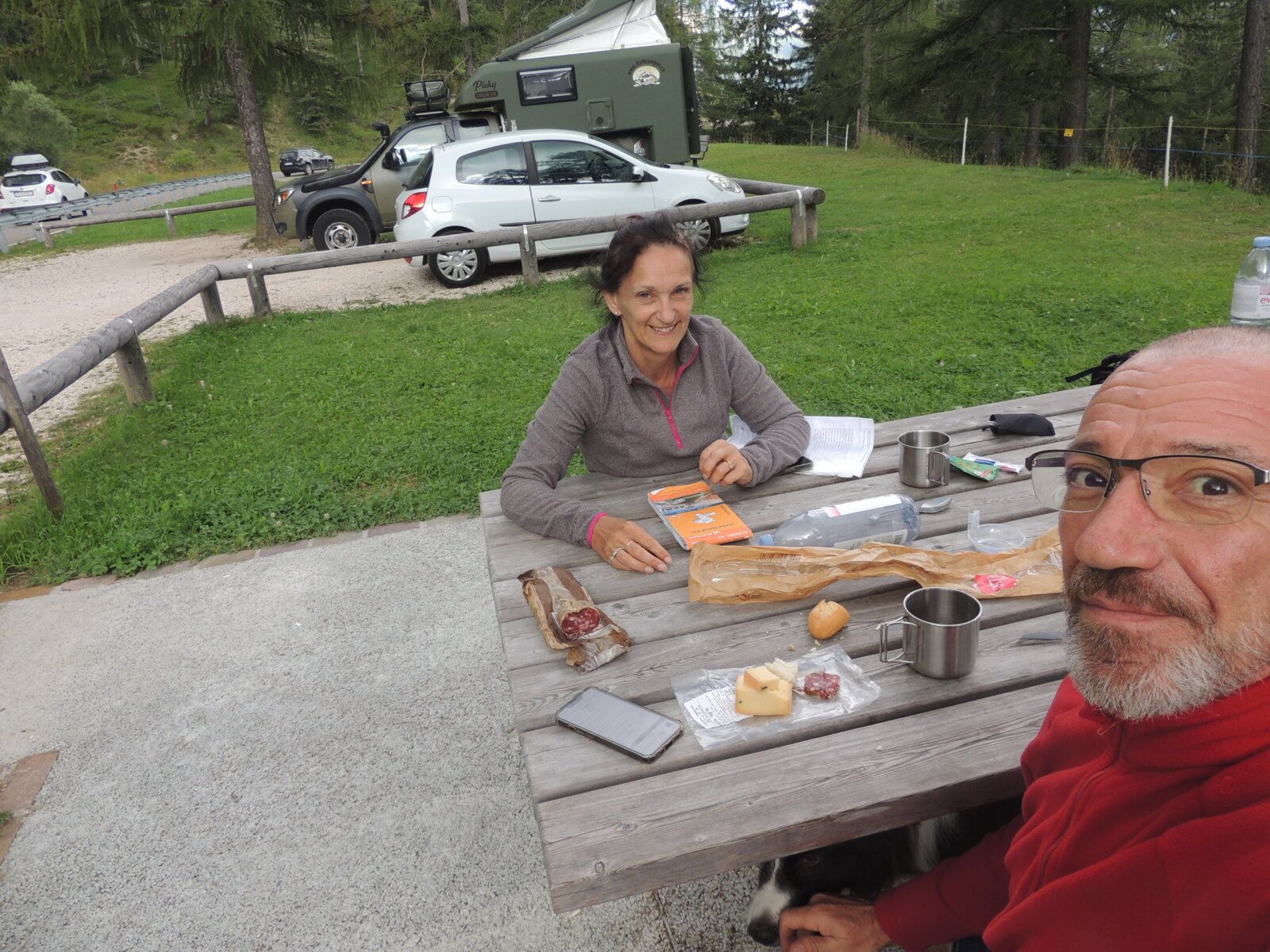 Les dolomites étant une destination chère même très chère, je suis partie avec un plein de course, mon matériel de camping, évidemment (tente, matelas, gonfleur, duvet, oreiller gonflable, 1 table et deux chaises de camping, vaisselle de camping (tasses + assiettes + couverts + gobelets), j'ai emporter du sopalin, 2 torchons de cuisine, du liquide vaisselle, une petite éponge pour la vaisselle, du "genie" sans frotter au cas, j'ai du linge à laver, des lingettes nettoyante, du papier toilette, un opinel bien pratique pour trancher du saucisson, une petite planche à découper en bois pour couper mes tomates, un plaid pour ce poser par terre, une bouteille d'eau ou une jerrican d'eau non potable en cas de besoin pour se laver les mains, donner à boire au chien où autres, une gourde filtrante pour remplir n'importe où, un petit réchaud pour le thé où le café à toute heure.