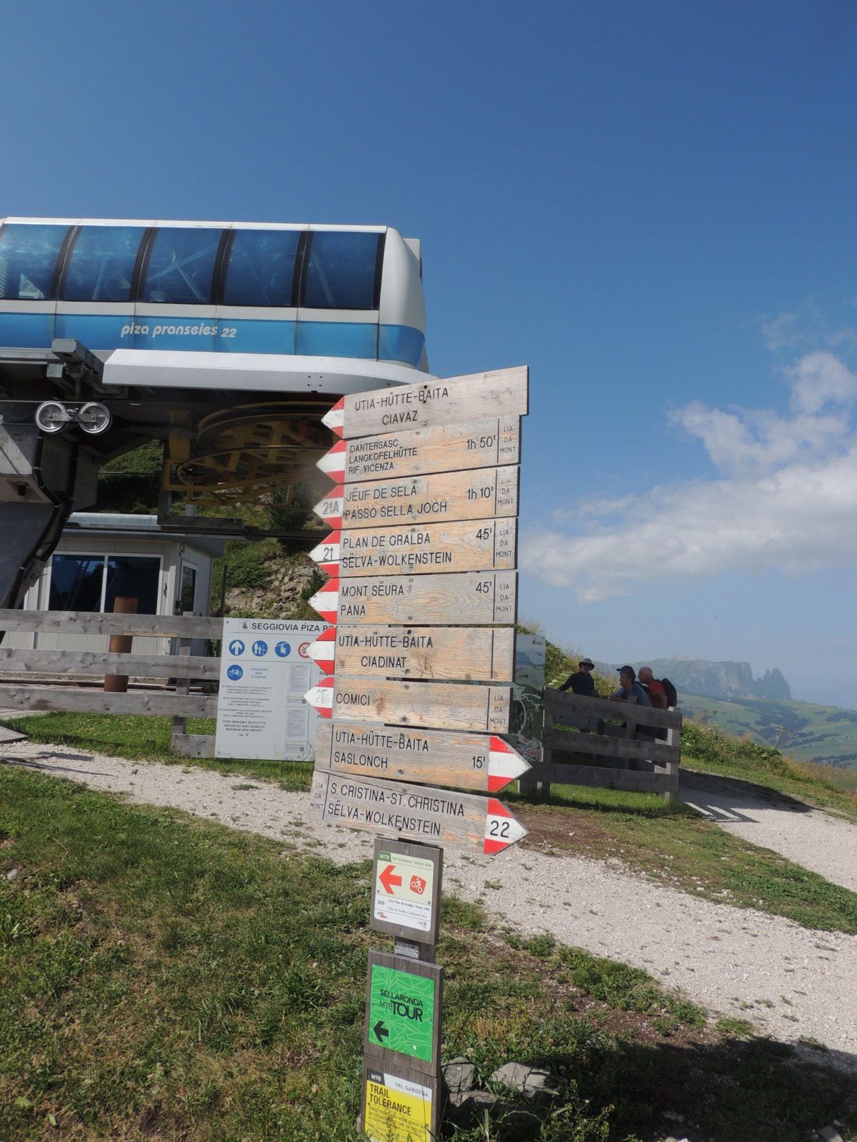 On commence par le téléphérique de Mont Sëuc à Ortisei (Alpe di Siusi), que l'on prend vers 10h08. Il nous dépose sur un vaste plateau herbeux baigné de lumière. C'est l'endroit rêvé pour les promenades panoramiques, mais ce n'est pas notre destination finale du jour.